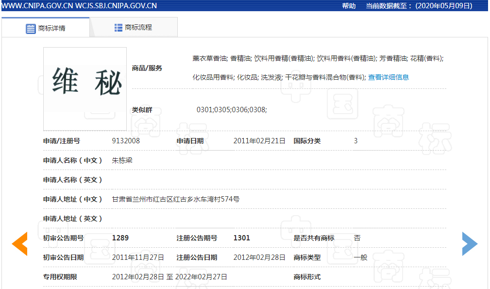 2011年02月21日,朱某申请了第9132008号“维秘”商标,该商标于2012年02月28日注册成功,核准注册在第3类薰衣草香油; 香精油; 饮料用香精(香精油); 饮料用香料(香精油); 芳香精油; 花精(香料); 化妆品用香料; 化妆品; 洗发液; 干花瓣与香料混合物(香料)商品上。