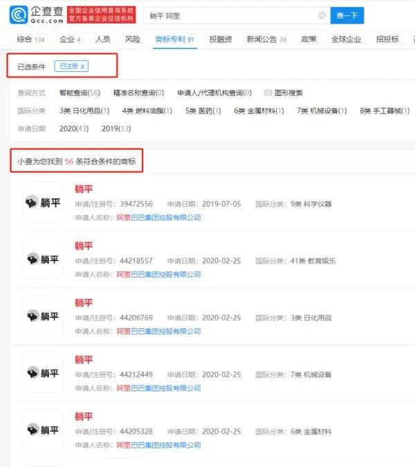 企查查APP显示,阿里巴巴目前共申请注册躺平商标91次,其中56个商标已注册,包含躺平、躺平设计家、躺大平。